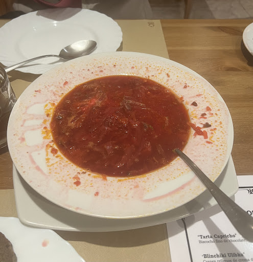 Read moreBuenisimo restaurante ruso, con mejores ejemplos de la cocina de este pais.Un servicio impecable si te atiende la misma dueña, Tatiana. Habla catellano perfectamente aunque es de Moscu, y te aconseja, no te deja pedir mas platos que puedes comer , siempre esta pendiente que " sera mucho ":-). Y si al final es mucho te pone al bote para llevar. :-) Son mis favoritos, ya que voy unos cuantos años..... El cocinero es un crack, he comido alli mejor BORCH que en la misma Rusia y mejor ensaladilla rusa que en la misma Rusia. No exagero! He probado ya TODO en este sitio y os puedo aconsejar con que me quedo al final: Blinis con setas ( son mejores que rellenos de carne ), Borch ( la mejor de las sopas qud tienen y muy imprescindible en invierno ), de entrada no se puede perder ENSALADILLA OLIVIE. Tambien albondigas con pure dd patatas casero y salsa Stroganoff son muy buenas. No me han impresionado los platos como Esturion y algo con caviar, pero hay de todo..... De vinos suelo eligir Cune para tener uns apuesta segura o se puede pedir la cerveza rusa, don varios tipos y en verano sirven bien fria. Los postres son muy buenos tambien, a precios muy razonables, y pan negro autentico como en Rusia y cortado muy fino, es un detalle importante....esta lejos este restaurante, " en la mitad de nada " como dice mi amigo, pero aun asi vamos incluso desde Madrid y siempre cuando podemos. Larga vida a este...