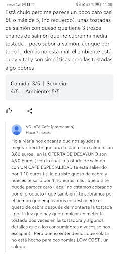 Analizando sus problemas con más clientes (que podéis leer en las reseñas) : Según la dueña:"volata café no está hecha para economías LOW COST"!! (adjunto LAS CAPTURAS de pantalla en la que lo dice; y de otros clientes insatisfechos con el que la dueña ha salido tarifando y se enfrenta en redes). Hay gente que no debería trabajar de cara al público. Ojalá un chicote en este local!! ;) Risas íbamos a tener aseguradas!