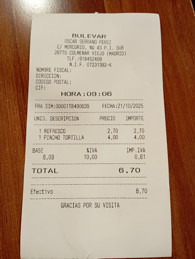 Un pincho de tortilla y una Coca-Cola (de bote): 6,70 euros, me parece una barbaridad, es lo más caro que me han cobrado.