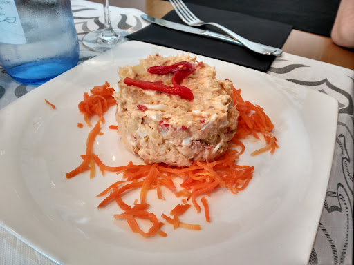 Todo muy rico. Qué espectáculo de comida. El menú 20€ pero merece la pena. De primero un pastel de cabracho, que lo hacen con el pescado fresco que tengan del día y estaba brutal y la ración enorme como para dos personas. De segundo unas carrilleras con patatas brutales, se deshacían estaban muy muy ricas y las patatas de buena calidad y fritas en aceite limpio no sabían nada mal. El pan muy tierno. De bebida agua bezoya en botella de cristal y la casera es casera de verdad no marcas raras. Lo que más me gustó es que a pesar de haber dos camareros para todo el restaurante y la terraza no hemos esperado casi nada por la comida, el servicio muy eficaz y rápido. En cuanto al postre de menú había tarta de queso, arroz con leche, tarta de la abuela y helado. Pedí la tarta de queso y estaba muy rica, echa al horno. Lo malo es que no tenía base de galleta y la mermelada que pusieron no pintaba nada, pero quitando eso a un lado. Muy rica, suave, pero con sabor. El local muy limpio no veías una sola miga de pan en el suelo y hasta los cristales tan limpios que parecía no haber. Por cierto un detalle lo del aire acondicionado para comer a gustisimo aunque haga mucho calor. 100x100 recomendable! Sin duda...