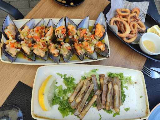 La comida es correcta. Pedimos mejillones a la vinagreta, rabas, navajas y hamburguesa.