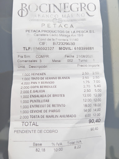 La carta consta de una sección de productos y recetas tradicionales de la zona, pero con el toque de Bocinegro. Tiene mucho protagonismo el atún, como no podía ser de otra manera.