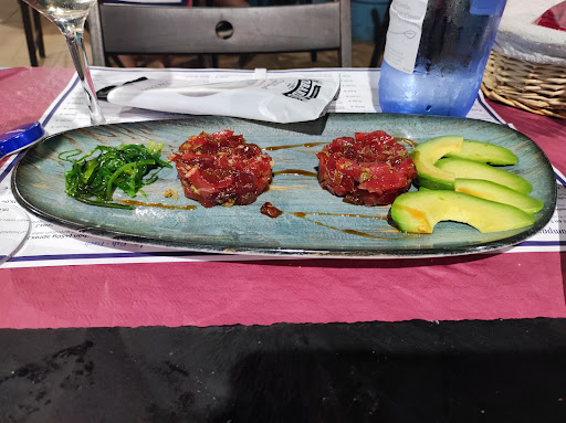 We were welcomed very friendly and ordered the "Bluefin tuna tenderloin and strawberry salad dressed with a pistachio pesto vinaigrette" and were served a salad made of greens with chunks of canned tuna and 3 (three) strawberries. The Strawberries were not fresh but came from a can, consistence of mushy pulp. The whole plate and salad was ice cold, obviously pre prepared and sitting in the freezer for hours. My main - a charcoal grilled tuna steak from the flank - turned out to be about 70 grams of broken pieces of grilled tuna, my girlfriends charcoal grilled Dorada came in a pool of oil no traces of charcoal grilling except a completely burned fishtail- When we addressed the waiter about this he shrugged his shoulders, said he would tell his boss and was never to be seen again. Payment was handled by another person. I dont know what went wrong at this place but it was by far the worst experience in Conil. The salad is plain...