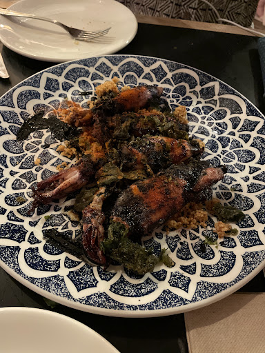 Pedimos unas patatas bravas y un calamar a la plancha. El calamar estaba bastante duro y las patatas bravas eran unas brochetas de patatas cocidas, cortadas en mitades con su piel y todo y con una salsa de tomate de bote, que en mi opinión estaba bastante mala.