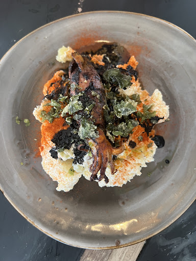 Pedimos 1 entrante que fue la ensaladilla con chipirón en su tinta. Un plato agradable y correcto salvo porque no limpian por dentro el chipirón (pero vamos, que es una cuestión pasable). Después pedimos 2 hamburguesas de wagyu (o eso decía la carta) que tenían pinta de ser industriales y que no pasaran a la historia ni de lejos. Pan bríoche y acompañadas de huevo frito y con Patata frita casera (esto último algo de agradecer).