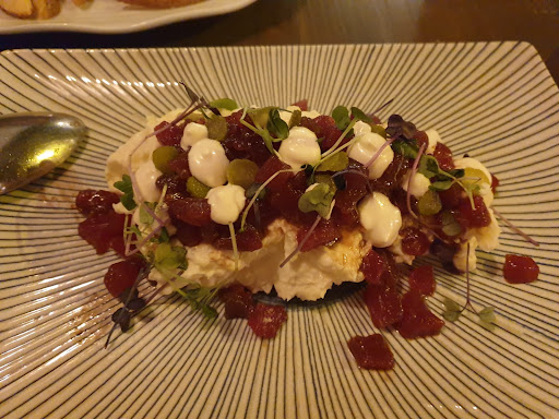 La ensaladilla no nos llegó hasta pasadas 1h10 minutos. Cerca de las 00h nos llegan las croquetas, las cuales estaban congeladas (no frías, CONGELADAS) y pedimos que se las lleven y nos traigan otras. Además, nos dicen TRAS 1h30 que no tienen solomillo de vaca y que pidamos otra opción que en nuestro caso fue presa de vaca. La cantidad de este plato fue ridícula, fueron 5 filetes muy pequeños que en total no llegarían a los 150g. Cuando nos trajeron las croquetas por segunda vez, de nuevo volvieron a llegar algunas CONGELADAS.