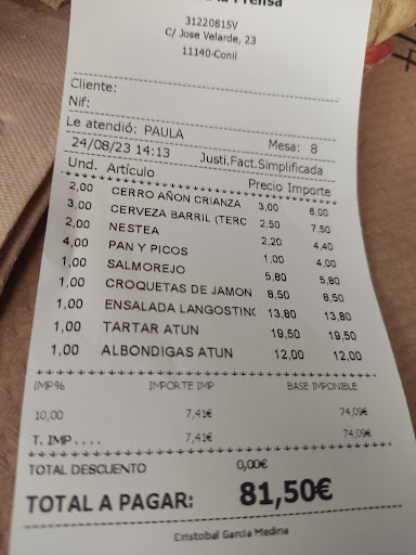 Todo nos encantó, y con una botella de vino incluida, la cuenta fue de unos 77€ en total, muy razonable para la calidad y la experiencia que ofrecieron.