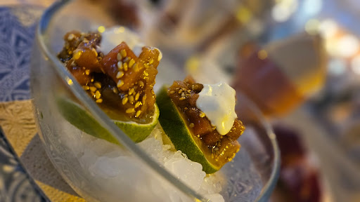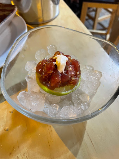 Muy destacable, el tartar de atún de almadraba semipicante sobre lima, una explosión de sabor, contrastes, para comerse 30 de golpe! Muy destacable todo lo que hacen con cabrales, pero en especial las croquetas de cabrales! No dejes pasar la oportunidad de pedir una ración! Muy destacable, las patatas bravas, aunque parezca un plato "típico" la camarera SHEILA nos recomendó probarlas y no defraudó en absoluto! Por último, muy muy muy destacable fuera de carta el souvlaki de pollo marinado con láminas de rábano, sabores Griegos en el sur de España, todo un acierto,...