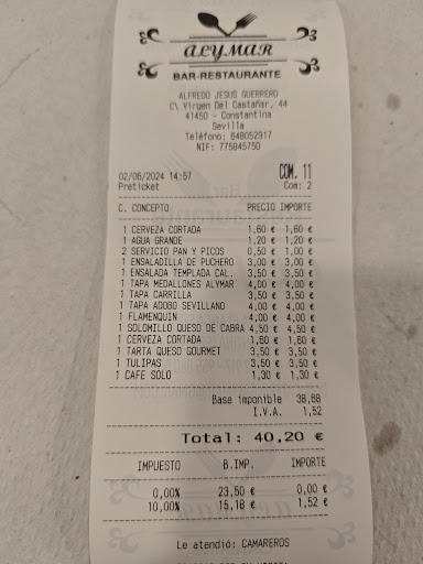 Read moreSe encuentra situado frente al hospital de la localidad de Constantina, y al lado de la carretera. O vas de paso, o de propio. Debido a estas características además de por ser Domingo, tardaron bastante en atendernos. Un pequeño consejo a este respecto común a la hostelería : se toma nota de la bebida y se sirve la misma para no tener a los clientes esperando sin nada que tomar durante 45 minutos. Si además, tienen la deferencia de acompañarlo con unas papas "aliñás" por cuenta de la casa, para ir picando sería completo. Tomamos ensalada Alymar, huevos rotos con jamón, pirámide de secreto ibérico, y de postre una torrija caramelizada. La ensalada muy completa, con bastantes nueces, y queso de cabra. Y el resto sabroso, y bien...