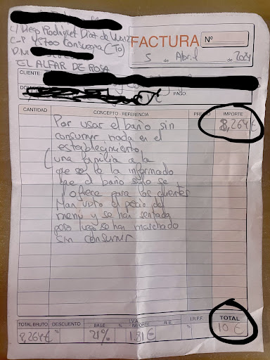 uimos en familia, llegamos 4 adultos y 5 niños con edades comprendidas entre los 4 y los 11 años, faltaban 4 adultos por llegar, mientras llegaban, los niños hicieron uso del aseo. Cuando llegó el resto de la familia, decidimos no quedarnos por la escasa oferta gastronómica, solo tenían un menú, sin más opciones que los platos del menú. Al comentar que habíamos decidido no quedarnos, la señora montó en furia y nos dijo que debíamos de pagarle el uso del aseo ya que solo es para los clientes (en ningún momento nos dice ni lo mas mínimo si el baño tiene algún coste o no, ni se nos ocurrió preguntar...), en lo que estuvimos de acuerdo y le abonamos los 10€ que nos pidió... Nos cruzamos justo enfrente Restaurante Doña Jimena, muy amplia oferta gastronómica...