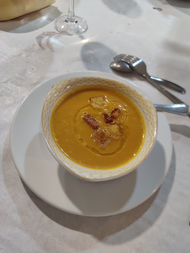Read moreFuimos a este restaurante porque era el que tenía mejor nota de de la zona, sin embargo, la experiencia en él no lo fue. El sitio se encuentra en los bajos de una vivienda, sin un cartel en la calle ni una señal que indique el acceso, y con los cristales de las ventanas oscurecidos, no se veía bien si estaba abierto o cerrado. La sala es bastante oscura. Además, la comida no fue del todo de nuestro gusto, siendo muy sencilla para el precio: 18€ el menu con primero, segundo y postre o café (solo incluía como bebida agua o vino, los refrescos no). No había muchas opciones de platos y todas eran muy simples. En cuanto a los segundos, el pescado estaba algo enegrecido y para los casos que pedimos carne, nos la trajeron al punto de su antojo, pese a que la camarera nos preguntó previamente como la queríamos. Pedimos 3 cafes(dos solos y uno con leche) y lo trajeron al revés, aunque la camarera se disculpó y nos preguntó si no nos importaba tomarlo asi y nosotros le dijimos que no no había problema. A pesar de nuestra buena fe y que no pusimos problemas ni a la carne ni a los cafes en el momento, no fueron capaces de tener el detalle de invitarnos a un chupito o un cafe (ya que pedimos un par de cafes extra) como disculpa por los errores cometidos en nuestra mesa. No merece la pena. Muy sobrevalorado en cuanto a...