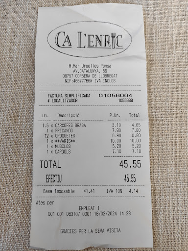 Read moreHemos ido a buscar comida para llevar, es domingo y a nadie de casa le apetecía ponerse en la cocina así que cap a Ca l'Enric a buscar alguna de sus delicias. Hemos cogido caracoles, croquetas de pollo, mejillones, alcachofas a la brasa, fricandó, y pastel de tortillas. Todo estaba delicioso y no he podido hacer fotos porque ha habido avalancha... pero busco el ticket para que veais precios y en cuanto lo encuentre le hago foto y la subo. Resumiendo, muuuuuy recomendable!! Hemos ido a comer un menú al mediodía entre semana. Todo estaba delicioso. Local limpio, servicio muy atento. Os dejo fotos. Sigo...