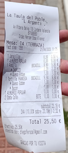 Read moreLa comida muy buena espectacular todo a la brasa, lo que el precio algo excesivo, sobre todo un bocadillo solo de panceta 10€ + 1Longaniza 2,20€+ 1Loncha de queso 1€ total del almuerzo 13.60. En carta un bocadillo de francesa con embutido 9.90, lo he pedido en vez de embutido con patatas y queso y me han cobrado 9'90 de base por un bocadillo de francesa y lo demás a parte como podéis ver en el ticket. Me parece exagerado y no tiene mucho sentido lo de los extras en el bocadillo. Es una pena por qué todo los demás un 10. Pero por el precio...