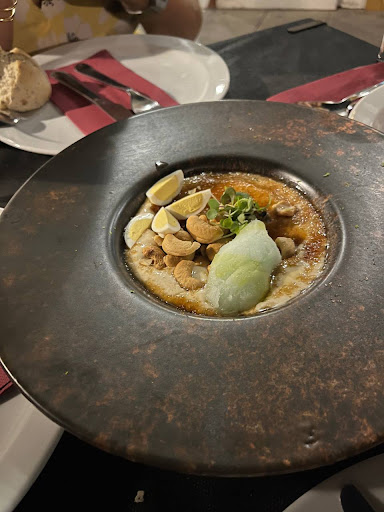 Imaginative flavour pairings. Carmelised almond camembert cream with sour apple sorbet and nuts was a perfect shared starter. My main of duck was tender and my husband's black rice dish was delicious. The onion and seed table bread was soft and great for dipping in sauces. The desserts were lovely. It was difficult to choose from such an excellent choice of dishes. Such a nice change from the majority of restaurants in spain ...not that we don't like spanish food but seeing virtually the same menu choices in every restaurant in spain gets tedious. It's nice to eat somewhere that serves something different. We really enjoyed our meal. Very reasonable price of 64 euro including drinks, shared starter, plus main courses and dessert each. The place itself is modern and the owners are friendly. ...