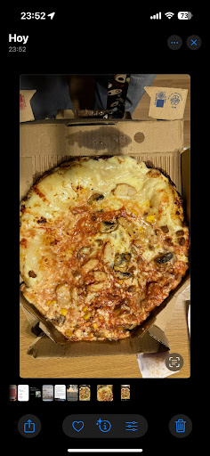 Read moreVengo a compartiros la lamentable situación que viví este fin de semana en el dominos pizza de coria del rio. Mi hijo fue con sus amigos a cenar el buffet ilimitado, uno de sus amigos se puso a tirar pizza, cosa que bueno son chiquillos de 12 años, y le negaron poner más pizzas a todos. Me llamó mi hijo y claro fui para allá ya que hombre no considero justo que se queden sin comer por culpa de uno y después de haber gastado 50€. Cuando llegue allí hable con una mujer de polo negro y gafas, empezó a explicarme la situación, y tras un rato y viendo que no llegábamos a ningún lado, empezó a hablarnos de muy malas maneras, diciendo explícitamente: "Si los niños quieren jugar que vayan al parque". En fin, empezó a faltarnos el respeto una y otra vez. Le pedí la hoja de reclamaciones y se fue para dentro y no salió más, tras 10 minutos de espera, llegó una compañera suya y me la dio. Finalmente, la rellené y me fui, lamentable situación vivida, no...