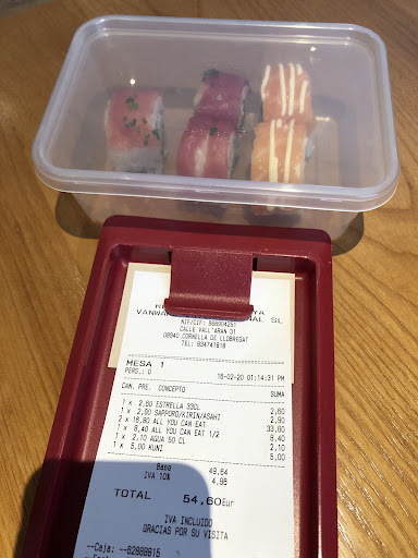 Truly the worst sushi experience I’ve ever had in terms of experience and taste. First of all, the all you can eat menu excluded special dishes, which are the nicest dishes on the menu. Drinks are excluded from the price also which is fine, but then you’re forced to buy a drink if you get the all you can eat menu. Moreover, you’re only allowed to order a maximum of five dishes per person each round, defeating the point of being all you can eat (especially if they charge you for not eating). Also, they have a kids price but the kids have to be under a certain height to get the special kids price as if it were an amusement park. Worst of all, the food is simply disgusting nearly inedible. The “salmon salad” was all lettuce and the “mango salad” was mostly mayo and lettuce. The miso soup at mercadona is better quality. The spring rolls literally only had cabbage inside - completely a joke!!! On top of that, the service is painstakingly slow. We waited over 40 minutes to get some noodles which they just put in the microwave. Furthermore, they tried to force us to leave early. When we asked to take the noodles to go they said no they’d have to charge us five euros. The waiter even grabbed my half full wine glass before I was done eating. On top of that, they charged and 8 year old child an adults fee, equating 25 euros. Truly an awful experience wouldn’t recommend...