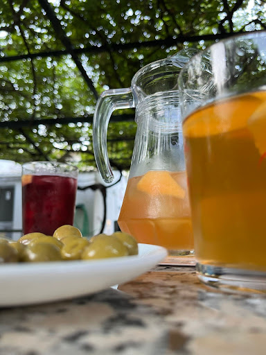 Excelente y agradable sitio para tapear. Las mesas todas bajo un emparrado, tambien con glicinias, que le dan al lugar mucho frescor en las noches de verano. Hay ademas zona protegida de juegos para niños donde se lo pasan en grande. Muchas tapas variadas entre las que resaltan las carnes de cerdo de la sierra, los tomates y verduras de la zona.. aunque tambien las hay de pescados. Solo abren...