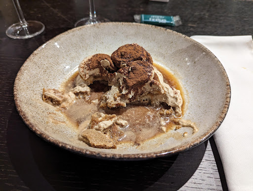 Luego llegaron las croquetas, que estaban templadas y aceitosas, y apenas tenían sabor. El aguacate "asado" era medio aguacate duro y frío, con tres langostinos mal limpiados y sin ninguna salsa o aderezo. El tartar de salmón con ají blanco era una broma de mal gusto: trozos grandes de salmón sin limpiar, con espinas, grasa y fibras, y un ají insulso y aguado. Los tacos de cochinita pibil eran una masa seca y sin gracia, con rúcula en vez de cilantro y sin ningún toque ácido que le diera frescura. El bao de... algo era un pan frío y grasiento, con una carne irreconocible y una salsa extraña. Solo le dimos un bocado y lo dejamos. Y el tiramisú, que supuestamente era "receta tradicional", era un desastre: un bizcocho deshecho y empapado en una infusión de café frío que nos sirvieron en una tetera. Véase la foto.