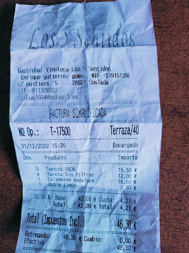 Tuve que pedir la cuenta (que adjunto) porque no creía que me cobraran 46 € por 10 cervezas y una "tapa" de calamares (le llamo tapa porque no lleva pan y lleva como mucho 10-12 calamares).