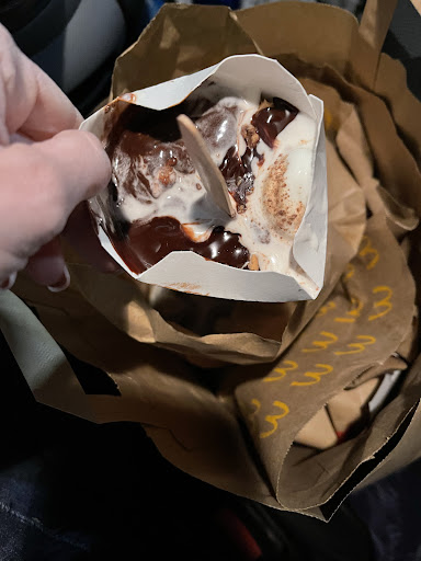 Al no haber nadie, nuevamente, tuve que dar la vuelta al mcAuto para poder hablar por el interfono con los empleados. La respuesta a mi helado derretido fue que lo acababa de poner (os pongo la foto para que juzguéis si está recién puesto). Encima, me acerco a la ventanilla y les comento lo del helado, pedir (por favor) que me den una bolsa de asas para poder separar alimentos calientes y fríos y el soporte de cartón para poder trasladar la bebida en el coche.