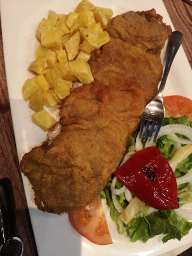 Escalopines de solomillo al cabrales Para mí uno de los mejores que he probado por el occidente. Rebozado fino pero con sabor, carne muy tierna y acompañado de patatinas y un trozo de pimiento al medio. La salsa cabrales la pedimos por separado.