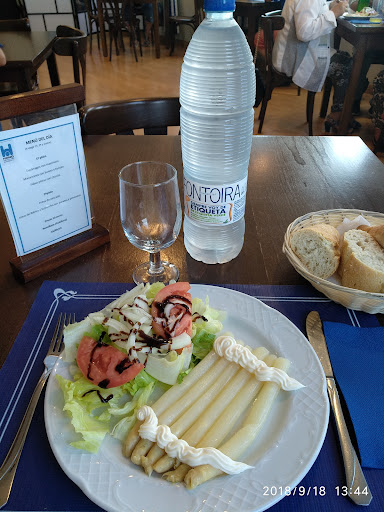 Un servicio si se le puede llamar así pésimo antipático seco son chulos y no llegan a pirulo 19 euros un menú que ni vale la pena comerlo los pinchos más de lo mismo mesas sucias camareros con el móvil!!!!sin atender a la gente y el peor el rellenito que lleva oro si lo es claro abría que verlo es una vergüenza una pena que un sitio así lo lleven esos tres....padre e hijos que no saben ni ejercer el gremio como se debe entre que uno con el móvil el gefe por la barra comiendo y con el móvil también por no decir todas esos vasos de cerveza de barril que se toma asta ejerciendo de cocinero si se le puede llamar así!!así va la hostería España por gente y locales como este repito una vergüenza no lo recomiendo no para parar a mear ajuntar un par de kilómetros va...