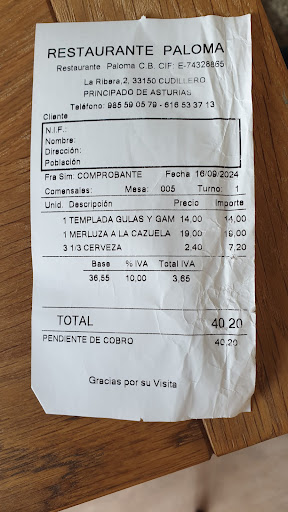 Read moreAlthough there are plenty of restaurants, Cudillero is a very touristy town, with good reason because despite the tourists it is charming. Usually tourist food is of low quality but we were lucky enough to secure a spot at La Paloma and had an excellent meal. We had the hake (merluza) which came in a parsley sauce and the prawn salad which also came with grilled cheese which was delicious. Washed down with a couple of beers this came to €40, rather pricey but we prefer quality over quantity and I think the other places were charging...