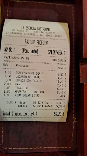 Read morePara empezar, el sitio está bien situado si te alojas fuera del casco histórico ya que está en la avenida principal. Fuimos para cenar y el personal fue muy agradable con nosotros aunque fuésemos con un carrito de bebé. Pedimos para compartir unos torreznos de Soria con pimientos de padrón. Los torreznos estaban buenos pero un poco de sal en exceso para mi gusto. Como principales pedimos lagarto con asadillo de yogur y dorada con costra de cacahuete y albahaca. El lagarto nos pareció un poco grasiento pero estaba bueno. Con respecto a la dorada, la combinación de cacahuete y pescado me chocó al verlo en la carta pero el sabor y la sinopsis entre pescado y fruto seco me encajaba bien. No obstante, el añadir toque crujiente al pescado no me hizo mucha gracia, ya que el cacahuete se confundía con la espinas pequeñas centrales de la parte delantera de la dorada. Como consejo, lo haría más tipo crema o salsa, ya que el sabor del cacahuete si encaja pero la textura no. Cambiando el nombre de costra por techo o tejado de cacahuete. Por último, el tiramos estaba muy rico, mi mujer echo en falta más bizcocho. Sin embargo, el mascarpone estaba muy bueno y se comía muy...