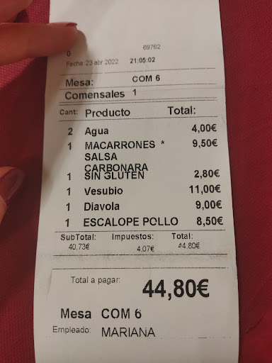 Pero la sorpresa llega con la cuenta (adjunto fotos de la comida, de la carta y de la cuenta): un SUPLEMENTO DE 2,80€ por la pasta SIN GLUTEN. Nos quejamos a la camarera con los siguientes argumentos: