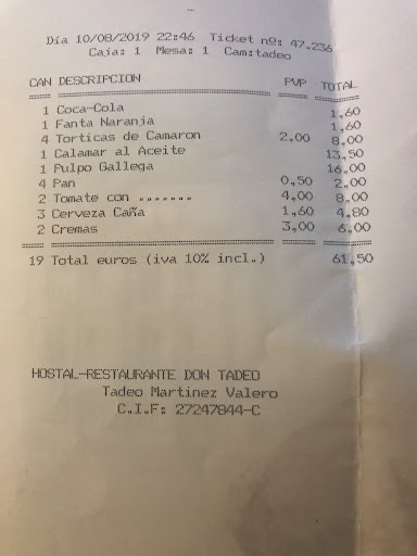 He estado unos días de vacaciones con mi familia en Vera y casi por casualidad fuimos a cenar a Don Tadeo. Tuvimos que volver otras 2 veces. Sobresaliente de verdad. Un restaurante familiar, con un servicio super agradable y una materia prima que ya quisieran algunos estrellas Michelín. El precio no puede estar más ajustado y en mi opinión hasta es barato. Su reclamo principal es el arroz con bogavante que probamos el último día. Pero nos enamoró una simple ensalada de tomate “muchamiel” cultivado por ellos mismos. Tomate, aceite y sal, nada más. Sencillamente espectacular. Al igual que la pata de pulpo a la brasa, el segundo día tuvimos que pedir dos y éramos cuatro personas. Riquísimo también el calamar en aceite con patatas. El vino blanco de la casa muy rico y económico. Las cañas y refrescos 1,60€ en un restaurante no lo he visto en mi vida. El milhojas de postre también delicioso. Tal vez no volvamos de vacaciones a Vera porque no nos gustó demasiado, pero tengo clarísimo que si me acerco alguna vez por esa zona ya sé donde ir a comer. Muchas...