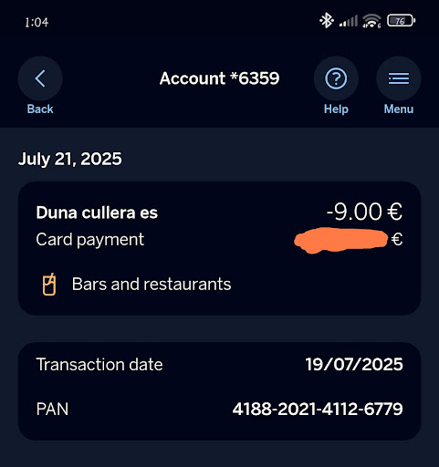En la primera ronda, una de nuestras amigas pagó con efectivo los chupitos. Luego mi otra amiga pagó con tarjeta los 18€ de los dos cubatas que habiamos pedido. Una hora después, fuimos mi amiga y yo a pedir un cubata más. Nos atendió una señora pero después de darnos el cubata se fue y su compañera nos cobró. Pagué los 9€ y nos fuimos. Al rato, vino la señora que me atendió para decirme que me fui sin pagar. Me estaba hablando con malas maneras como si fuera una ladrona: diciendome que no habia pagado, que me tenia que haber esperado, etc. Le enseñé el móvil y le dije que no fui sin pagar y que allí estaba la prueba pero queria ver la hora de la transacción y en la app de mi banco no sale la hora (cf foto 1), me dijo que ya me vio en la barra antes y que eso era el pago que tengo en el móvil. Insisti porque claramente, no iba a pagar 18€ para un cubata y sabiendo que habia pagado. Me amenazó diciendo que tengo prohibido acercarme al bar y que va a avisar a los de seguridad. No dije nada pero segui buscando el pago dónde aparece la hora. Al final encontré en la app de wallet del móvil la transacción dónde aparece la hora (cf foto 2), fui a buscar a la señora y se lo enseñé pero ya no queria saber nada pero insisti y le toqué el brazo para que lo viera porque era una prueba y queria que lo viera. Me dijo que no era de ese momento que era de las 10 de la mañana que serian las 22h y no las 10. Mi móvil está en inglés, obviamente todo está en inglés, el formato de hora es de 12h y la hora ponia 10:01 PM. Le dije que lo mirará bien porque el móvil está en inglés y me dijo con sarcasme "humm vale pues en inglés". Poco tiempo después vino a buscarme y diciendome que le habia empujado, que ella era la encargada del local y que no sé qué no sé cuanto. En ningun momento le habia empujado pero bueno... Al final, mi otra amiga vino y me preguntó cómo he quedado (obviamente se preocupaba porque me conoce y sabe que no soy una persona conflictiva ni la tipica que se iba a ir sin pagar) y le estaba contando con detalles lo que habia pasado. En ese momento, el de la seguridad me llamó la atención y haciendome señas de que estaba hablando demasiado del caso y que si siguiera que me iba a tirar del local.