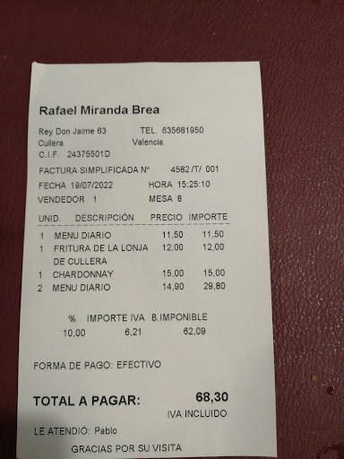 Read moreLo primero, felicitar al equipo que aquí trabaja, pues la atención fue totalmente buena y profesional. La comida tremenda, y no se hizo esperar como he leído en reseñas negativas de las cuales he hecho muy bien al no fiarme. Fuimos 4 y un niño con un menú de tres entrantes a compartir, y nos hemos comido un arroz negro que estaba realmente exquisito. Y el niño un plato de nuggets con patatas que le ha encantado y el cual también cuidan al detalle. Vino blanco bueno, frío, y cuidan de que así se mantenga. Grata sorpresa al ver la cuenta pues considerábamos que lo que habíamos comido, y la cantidad/calidad de la misma iba a ser más caro, pero no fue así. Y hace calor, porque es el mes de Julio, y en Cullera en Julio hace calor, no porque ellos no intenten refrescar el ambiente como he leído en otras reseñas. Me parece tremendamente injusto que este restaurante no tenga 5⭐, pero como siempre, gentuza intransigente y que se creen los protagonistas de un salón lleno de gente. Seguir así, tenéis uno de los restaurantes top de Cullera, si no el mejor. Muchas gracias por la excelente experiencia culinaria que hemos disfrutado hoy. Y de verdad, me reitero porque me parece injusto... obviar cualquier reseña negativa de este sitio, porque no lo merecen. Gracias, y por supuesto que volveremos cuando...