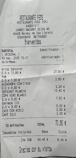 Read morePrimera vez en Fede, fue muy recomendado y tenía muchísimas ganas de probarlo, encargamos un arroz seco de bogavante, pero nos sirvieron un arroz caldoso , al decirles que era seco lo que habíamos encargado , se disculparon , y fueron muy amables y se lo llevaron pero nos supo mal y les dijimos que daba igual que nos lo comeríamos ya que nos dio un poco de pena y cualquiera puede tener una equivocación, ofrecieron ponerlo al fuego para que se consumiese un poco el caldo y quedase más seco, pero lo que ocurrió es que el arroz se quedó pasado y el bogavante seco , de todas formas el sabor era rico y nos lo comimos, la verdad que el servicio fue excelente , pero hubiese sido todo un detallazo que por lo menos nos hubiesen invitado a los cafés ….ya que se habían equivocado con el arroz y fuimos bastante comprensivos con el error y no exigimos que nos lo cambiasen , pero no fue el caso,nos cobraron por todo , entrantes , arroz, postres ,cafés y hasta el pan …. De todas formas volveré porque me gusto el trato de los camareros , el sitio , y a pesar de la equivocación y luego estar pasado el arroz , si que tenía buen gusto ,espero que tomen nota, hubiese dado 5 estrellas si hubiesen tenido el...