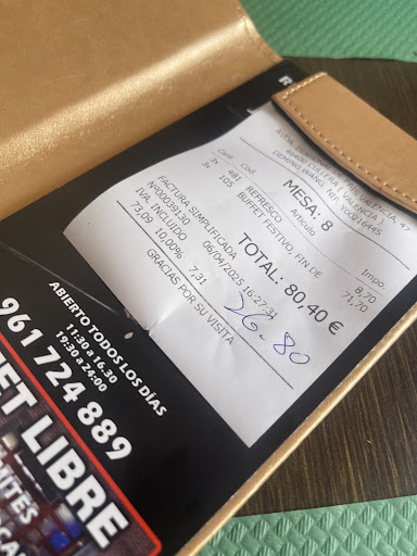 Read moreHay varias cosas a destacar. Enumero: Visitamos este sitio 5 personas, de las cuales, ninguna era de Valencia, por lo tanto nada más sentarnos, el camarero debería de habernos explicado la carta, pero no lo hizo. No nos explicó que X platos de la carta iban a un precio diferentes que el resto. Mi abuela y mi tía le preguntan al camarero que si SE PUEDE pedir un buffet para 2 personas a lo que el camarero responde que SÍ. Por lo tanto mi hermano un buffet, mi tia y mi abuela otro y por últumo yo. LO PREGUNTAMOS ANTES DE NADA, puesto que si no se puede, pues no pasa nada. Comemos y tal, el sushi mucho arroz y la comida nada del otro mundo. A la hora de pagar vemos que la suma asciende en torno a 72€ y claro, unos 10 € por persona, imposible que ascienda a 72€. Vamos a reclamar y pedir explicaciones y pasa esto: El supuesto jefe llama al camarero ya que nosotros le habíamos preguntado que si HABÍA LA POSIBILIDAD de pedir un buffet para 2 y nos habían cobrado 4 buffets, en vez de 3. Viene el camarero subido de tono y empieza a increpar que en NINGÚN momento habíamos preguntado eso. Y encima tiene la cara dura de decir, que cuando llegamos, nos EXPLICÓ la carta, que no fue así. El tono sigue subiendo hasta que sale del propio camarero decir que paga ese buffet de más ( sabía que lo había hecho mal y quiso enmendar) pero el jefe no cogió el dinero. Nos dejaron por mentirosos y encima tuvimos que pagar platos que no entraban en el buffet por culpa de la NO EXPLICACIÓN del camarero.