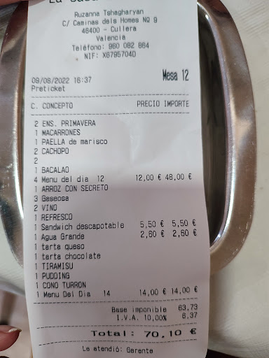 Read more¡Hemos tenido un gran gusto el haber comido el día de ayer en Cullera! 5 estrellas por la atención de la Srita. Luna, un encanto! Comida deliciosa, (la Srita. Rosana, excelente cocinera! ) el lugar por demás: muy simpático, central, y muy cerca de la playa con muy buena Carta/Menú, gran variedad platos a escoger, para todos los gustos! ¡Precio razonable, muy buena calidad/sabor + atención = volveremos muy pronto! Wir hatten gestern eine große Freude beim Mittagessen in Cullera! 5 Sterne für die Aufmerksamkeit von Frau Luna, ein Schatz! Leckeres Essen, (Frau Rosana, ausgezeichnete Köchin!) Der Ort für andere: sehr schön, zentral und sehr nahe am Strand mit einem sehr guten Brief / Menü, eine große Auswahl an Gerichten für jeden Geschmack! Angemessener Preis, sehr gute Qualität / Geschmack + Aufmerksamkeit = wir kommen sehr...