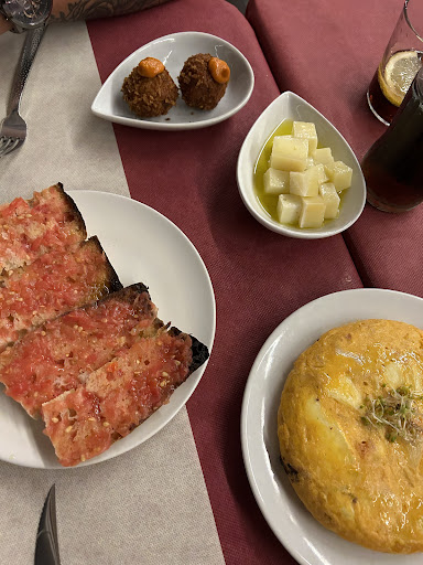 Los camareros con poca atención en las mesas a pesar de que eramos pocos comensales en la noche tuvimos que pedirle el agua, el pan, y la cuenta dos veces (cosa que nos intentaron cobrar de más). Las raciones son increíblemente minúsculas, es más una broma que una comida. Apesar de que te sacan un bol de aceite con 4 quesos hundidos no tienen la iniciativa de traerte el pan, y para colmo se llevan los platos y antes de traertelo. Pedimos de picar para compartir ya que si no haciamos todos menú no podiamos cojerlo ningúno de la mesa. Y dicho eso las raciones eran cada uno de un tamaño, es realmente vergonzoso.El peor restaurante que he ido, que te traen un vino de la casa por 15€. Sin contar que le devolvimos un plato de dados de ternera, que eran 6 dados de tamaño aceituna a 15,70€ que la camarera nos dice que en cocina lo han probado, cosa que no creo porque lo trinchamos entero para que vea en el estado sangriento y color gris que tenían los trozos pequeños, ya sin decir el trozo más grande que me lo terminé comiendo y sigo teniendo el chicle en la garganta , que no me sabía absolutamente a nada, carne de mala calidad vendida a precio de oro, sin duda unos ladrones, se creen que con los chupitos gratis se soluciona todo, NO Recomiendo y...