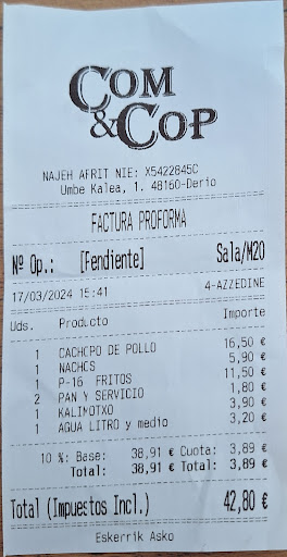 La verdad que tiene una buena carta, amplia, hay de todo, y algo que me gusta es que hay variedad en ensaladas. Todo lo que he probado delicioso, y no tiene mal precio, no le doy las 5 estrellas por que tardaron mucho en traer la comida, volumen de trabajo, supongo. Para volver sin problema. 29/10/2023 edito la reseña. Como veis hace dos años le di cuatro estrellas, en ese momento las merecía. Hoy me disponía a salir a cenar con mis amigos y no sabíamos dos ir, LES RECOMENDÉ ir al com&cop por cercanía y porque la comida está rica, las cosas como son; tenía el recuerdo de la ensalada ventresca, buena cantidad y buen sabor. Pero se ha quedado en eso, en un simple recuerdo. OS RELATO LA TRAJEDIA Llegamos y pedí el primero, una ensalada ventresca sin vinagreta. El camarero me tomo nota a mí y luego a los demás, tras una larga espera llegan 3 platos, faltaba el mío. No pasa nada tardará un poco más ... Les pido a mis amigos que empiecen sin mí que no tardaría, pasaban los minutos y yo solo habia comido un trozo de pan con aceite. Por lo que decido reclamarla, al paso de un camarero le llamo 3 veces y no para... Pasa los minutos y mi comida si llegar. Decido levantarme para notificar que falta la ensalada, pero que ya no la quiero (mis amigos ya habían terminadode cenar) por lo que me preguntan en que mesa me ubico, les respondo que eso da igual, que ya no quiero la ensalada. En 3 minutos tenía la ensalada en la mesa. El hombre, que no tenía nada que ver en el asunto, me pidió perdón, un buen gesto vaya... Pero de nada sirvió, le dije claramente que no la quería, y el en un modo educado pero muy alto me intento convencer, había una mesa con 10 personas alado mirándome... Intentó varias veces convencerme recordandome que estaba enfadado y con ello haciéndome sentir más incómodo aún. Tuve que pedirle que se vaya que me estaba haciendo pasar vergüenza. Me pidió perdón y se fue. Me parece un buen sitio donde comer pero el servicio así hace perder todo el valor....