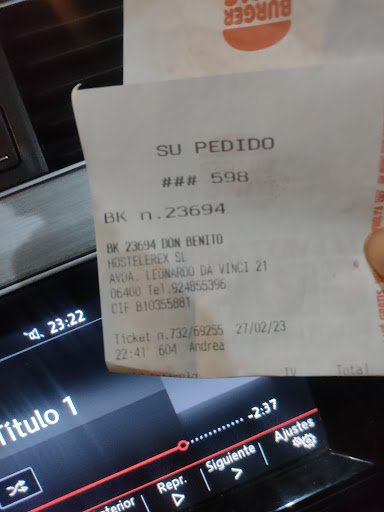 Read moreI am staying in Don Benito for a few days. This Burger King is very comforting because I can place my order at the kiosk in English. I am vegetarian and there are multiple vegetarian options, including the veggie Cheddar Wave sandwich. I must add that many napkins were placed in the tray and they were needed while enjoying such a sandwich. Burger King gives me options for meals without having to worry when lunch or dinner starts and asking special requests for a vegetarian meal. I am from the United States and I am very pleased to enjoy a larger variety here than what is available at the Burger...