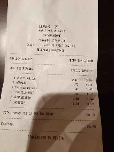 Read moreDie Bar Siete ist gut gelegen auf dem zentralen Platz im Ort. Wir waren drei Abende dort und haben durchwachsene Erfahrungen gemacht. Der erste Abend war eine Katastrophe, Samstag, viel Publikum und dazu eine sehr unorganisierte Bedienung. Mussten sehr lange warten, über eine Stunde, bis wir bedient wurden. Dann dauerte es fast ebenso lang, bis die Tapas serviert wurden, allerdings wurde der Tisch nur notdürftig abgeräumt und die Speisereste der vorherigen Gäste nicht abgewischt. Lecker! Es wurden dann bestellte Speisen nicht gebracht, aber am Ende auf der Rechnung aufgeführt. Der Kellner korrigierte das aber sofort, als wir darauf hinwiesen. Das Essen war aber gut, dass wir Sonntagabend wieder dort waren, und der Abend war sehr viel besser! Kein Wunder, diesmal arbeite wohl der Chef selbst. Montagabend war wieder Kellner 1 am Zug, es war aber viel weniger los. Essen total ok, am besten holt man Essen, Lappen zum Tisch abwischen und Getränke selber an...
