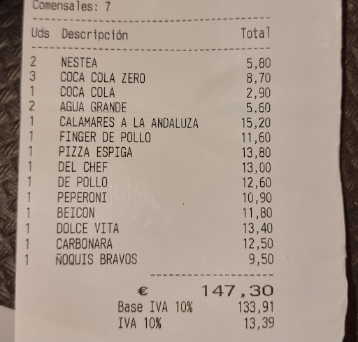 No suelo dar reseñas bajas pero me pesa más lo malo que lo bueno, sobretodo porque éramos 7 y nos ha costado la broma a cada uno +21 euros. En primer lugar los entrantes, es decir, he ido a muchísimos bares y restaurantes y jamás he visto que fueran tan caros y a su vez tan escasos, literalmente 9 calamares para 7 personas 15,20, tan buenos como el tremendo robo que nos han cascado. Luego los finger de pollo, 6 unidades de las cuales 3 eran diminutas 11, 60 y cuidado ahí, que hemos tenido que trocearlas para que uno no se quedara sin probar y de sabor normalito, eso sí, nos venía con un cacharrito de salsa barbacoa que creo que es en lo que menos han escatimado, de hecho si la hubiéramos usado en todos los entrantes muy probablemente nos habría hasta sobrado. Luego los ñokis con salsa brava y alioli, poco que decir aquí, hemos podido repetir 2/3 unidades cada uno que eso ha sido un LOGRO para lo que habíamos visto y catado y de sabor y cantidad decente, 9,50 la ración así que es el entrante del que menos queja tengo.
