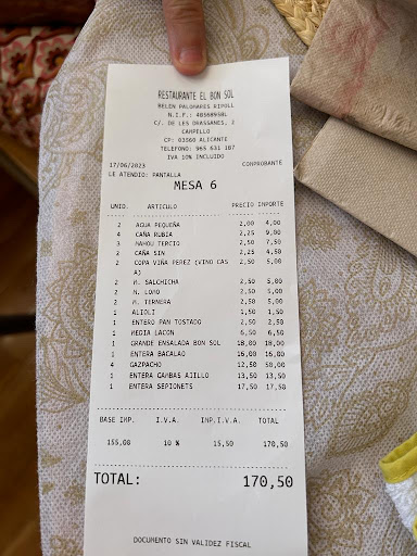 Great local restaurant in El Campello. They do smaller dishes along with main plates do not try for main plates after a few of the smaller dishes it’s too much. We had the B-road beans and chorizo ( bit salty for my taste) the veal in tomato sauce - fabulous, garlic prawns- delicious, bread and finally the cheese with honey and marmalade- exquisite.Main dishes were the squid- fantastic and the monkfish liver ( too salty for me. The white wine was good and all very reasonably priced. Would...