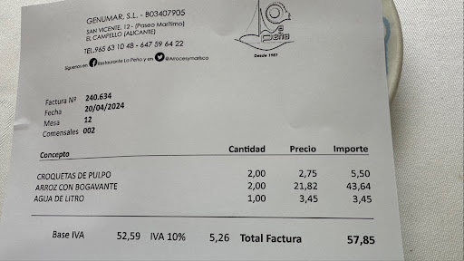 Terribly disappointing experience at 'La Peña' in Campello. We went with high expectations for the arroz señoret, but what we were served was a disaster. The rice tasted like salty seawater, the calamari had a strange taste. Clearly, the seafood wasn’t fresh. When we mentioned it, we only received an apology with no compensation, not even a coffee. Truly unfortunate. I do not recommend this place at all.