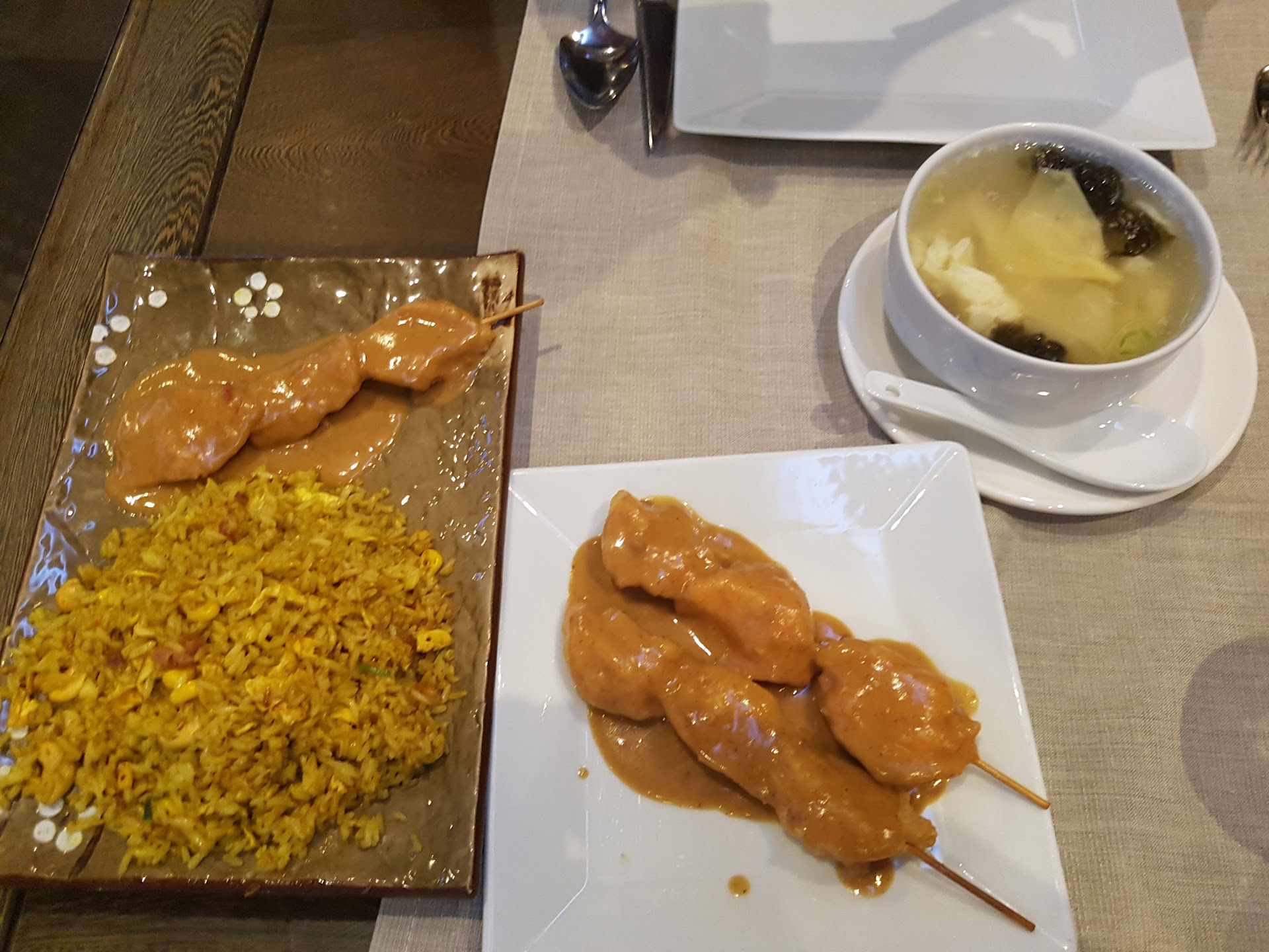 We went for Chicken and coconut soup Sau mai dim sum Sizzling prawns Egg fried rice Sorbet