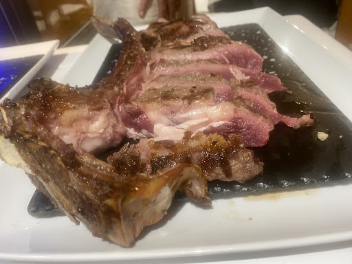 🍴 Torrezno a 9,50 la unidad. Lo pedimos para hacer tiempo con una cerveza mientras llegaban todos los comensales. Un precio elevado, pero de lo mejorcito que he tomado en Alicante y lo recomiendo vivamente. 🍴 Empezamos con pan tomate y alioli (1,5€ por persona). 🍴 Ensaladilla (5,5€). Correcta. 🍴 Calamares a la romana (14€). No sé por qué pedí calamares a la romana en lugar de pedirlos a la plancha… Estaban hechos en tempura y técnicamente impecables, aunque los encontré un poquito insípidos. 🍴 Mejillones al vapor (11€). Muy ricos y de buen tamaño. 🍴 Steak tartar (28,5€). Preparado en directo delante de los comensales, Yo que no soy mucho de steak tartar Me encantó, para mi gusto, el mejor que he probado en Alicante. 🍴 Entrecot XL (37€). Muy buena la carne, que salió un poco hecha de más, pero quizás fue culpa de los comensales que no se expresaron con claridad.