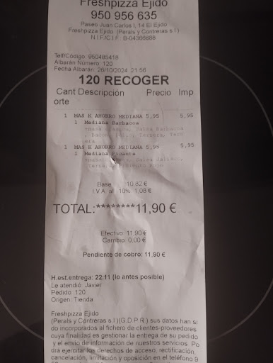 Horrible, cuando trabajan bajo el nombre +K Pizza empezaron bien, de hecho mi Pareja y yo éramos clientes habituales, en los últimos tiempos y siguiendo bajo el nombre +K Pizza se notó un descenso de nivel muy importante y tuve un par de malas experiencias con pizzas barbacoa que en lugar de barbacoa pusieron Ketchup y sinceramente se nota mucho, la primera vez pensé bueno se les habrá terminado y no voy a protestar y la segunda fue un ya lo siento pero no vuelvo, luego hablamos del nombre Fresh Pizza, creía que habían cambiado de gerencia y bueno nos decidimos a probar aver que tal, cuando entramos los trabajadores tenían camisetas de +K Pizza y ya el asunto olía a lavado de cara, pedimos un par de pizza y nos fuimos a casa, debo reconocer que la barbacoa llevaba salsa barbacoa pero la masa no me sabía como siempre más gomosa y menos parecida a la de antes (Que era estilo Telepizza), la mía no estaba mala era comestible pero la de mi pareja que era de la casa vegetal era Horrible, que la masa no era como antes se hacía más evidente aún, estaba salada y la verdura sinceramente dejaba un gusto ácido de hecho no nos sentó muy bien, en fin desgraciamente y viendo la calidad hay opciónes mejores en El Ejido, y seguro que en estos tiempos malos la propiedad quiere sacar más réditos por la crisis y es entendible pero si yo me acostumbro a un standard de calidad durante años y baja a este punto yo no puedo seguir pagando por estas pizzas y al final el reducir costes es reducir...