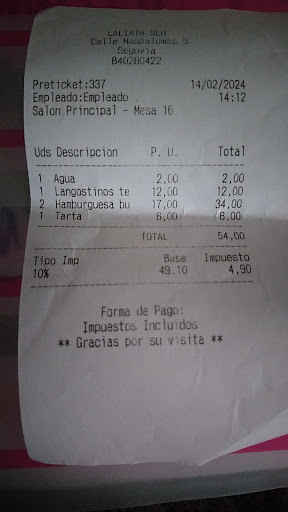 Read moreEl local está bastante bien, ambiente agradable, decoración chula y se estaba muy calentito con una estufa de gas al lado. El servicio empezó genial, muy atentos y educados, pero luego tardaban cada vez más en atendernos y finalmente tuvimos que ir a la barra a pagar tras esperar más de 10 minutos esperando a ver si se acercaban. Pedimos agua para beber (2€). Traen una botella de cristal con etiquetado de la casa, pero es obviamente agua del grifo. Ni siquiera la trajeron cerrada y la abrieron en mesa. Decidimos pedir platos de carta en vez de menú por comer algo especial. Craso error. Pedimos de entrante langostinos en tempura con mayonesa de soja (12€). Traen brochetas de langostinos en panko (de los que venden congelados, vaya) con mermelada de frutos rojos. Diferente a lo ofertado, pero bueno, vale, estaban ricos y recién hechos. Pedimos hamburguesa de buey (17€ unidad), y pésimas. La carne no solo era buey, sino un conglomerado preparado, pan frío del pack de 4 del super (¿tanto costaba pasarlo por la plancha?), lechuga y tomate, ni una triste loncha de queso, ni bacon, ni nada. Que digo yo, teniendo una carnicería con buen producto al lado, menuda caradura ofertarla como carne de buey y cobrar semejante bazofia a 17€ el plato. Sinceramente, os vais mejor al Burger que hay en frente y por lo menos no os engañan. En fin, decidimos pedir un postre para irnos con buen sabor de boca. Tarta de queso (6€). Por favor, no la pidáis. Un bizcocho con un sirope ácido que no pudimos ni acabar. No volvemos. 54€ nos ha...