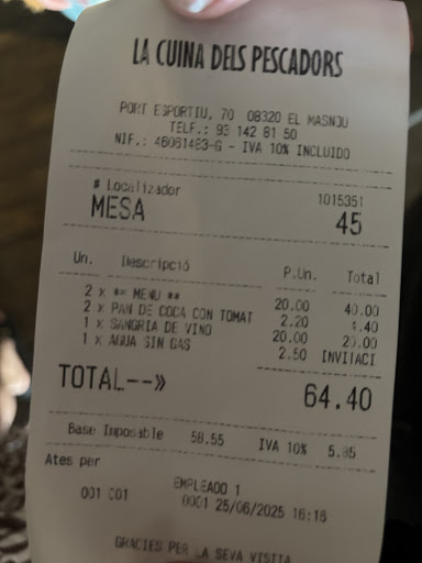 What an insult to the fishermans this restaurant so called fishermans kitchen! We advice you not to go there ever! We started with some tapas wich was the best of the hole evening. Croqettas and toasted bread with tomato, nice. the ansjovis from L’Escala were super nice but 4 half slices with Some garnish for 9,50€ come on! The insalata caprese was how do I discribe this .... the mozzarella had the structure of ricotta.... The Merzula fish was baken too long and tasted poor. It was garnished with a lot of vegetables but unfortunatelly the person how grilled these worked yesterday and soaked them in oil to keep them ‘fresh’. The raw chopped tuna was so over covered with teryakki sause I could not tell what fish I was eating. The postres looked promising but they failed too. The Cream catalan had chunks so it was not stired properly and the NY cheescake was defenitly made from a powder prefab package like the sold in the supermarkt 25 years ago. Really disgusting! I do not even want to talk about the waitress.....and the parking ticket they gave us to go out of the parking..... it did not work.... Better go to the most simpel Chiriguito any were on the beach they Will serve...