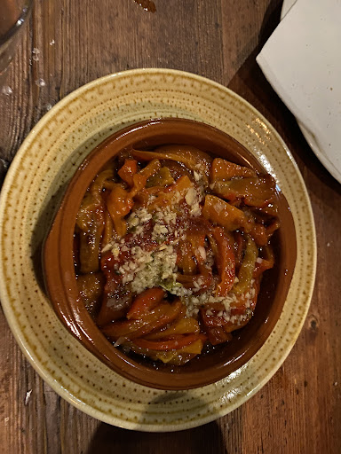 Los pimientos fueron una tomadura de pelo, puesto que es un bote de pimientos de los que compras en el supermercado con una especie de aliño por ecima. La carta me hizo pensar que sería verdura fresca asada ahí mismo, qué menos..