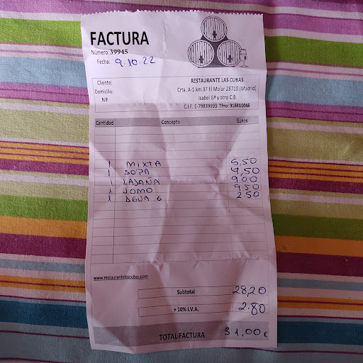 Read moreEl acceso cuando vas de viaje es dificultoso. No encontramos carteles que indicaran que estábamos en el Restaurante Las Cubas. El local es anticuado y hace mucho tiempo que no se renueva, pero eso no es lo importante. La cuestión es que, para lo que vimos y comimos, fue caro. ¡Ojo con el MENÚ DEL DÍA! No quisimos el menú del día (a 23 euros) porque al ir de viaje queríamos una comida ligera. Lo peor no es que los precios están un poco subidos (por ejemplo las bebidas a 3 euros): La comida era escasa y no estaba buena. Los aceites utilizados daban mal sabor y olor (se notó mucho en huevos rotos con jamón). En fin, para no repetir. No obstante, la atención fue correcta y adecuada en...