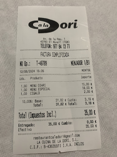 Read moreHemos comido varias veces en Ca La Dori. Comida casera buenísima y servicio muy rápido. Hoy hemos vuelto a comer y hemos disfrutado como siempre. Destacar la especial atención y amabilidad de Dori, así como el servicio y buena comida que sirven. Muchas gracias Dori a ti y a tu equipo, pues es un gusto comer así de bien, con vuestra atención y trato excelente con...